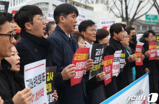 (서울=뉴스1) 박정호 기자 = 한국교총과 교사노동조합연맹, 전국교직원노동조합 등 교원단체·교원노조 관계자들이 20일 오전 서울 종로구 세종대로 정부서울청사 앞에서 가진 고 서이초 교사 순직 인정 및 순직 인정 제도 개선 촉구 기자회견에서 구호를 외치고 있다. 교원단체와 교원노조는 오는 21일 순직 인정여부가 결정되는 인사혁신처의 공무원재해보상심의회 개최를 앞두고 가진 이날 기자회견에서 유가족의 순직 인정 신청을 위한 조력 시스템 구축과 공무원재해보상심의회 교원 참여 보장 등을 강력하게 요구했다. 2024.2.20/뉴스1