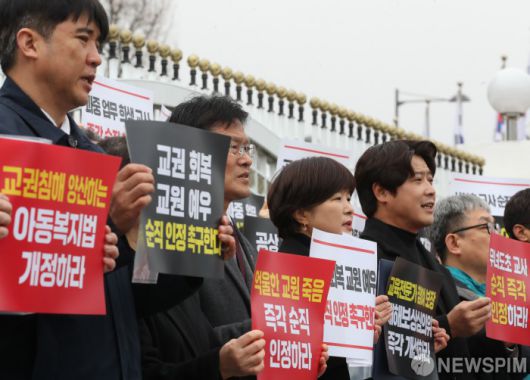 [서울=뉴스핌] 최지환 기자 = 100개 교원단체·교원노조 회원들이 20일 오전 서울 종로구 정부서울청사 앞에서 열린 故 서이초 교사 순직 인정, 순직 인정 제도 개선 촉구 기자회견에서 구호를 외치고 있다. 인사혁신처는 21일 故 서이초 교사에 대한 순직 인정 심의를 앞두고 있다. 2024.02.20 choipix16@newspim.com |