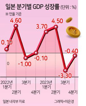 일본은 지난해 3분기 마이너스 3.3% 성장에 이어 4분기에도 마이너스 0.4% 성장을 기록했다. 시장이 전망한 1.4% 성장에서 크게 빗나간 성적표다. 달러로 환산한 지난해 일본의 명목 GDP는 4조2100억달러로 독일(4조4600달러)보다 적었다. 독일에게 밀린 것은 1968년 이후 55년 만이다.