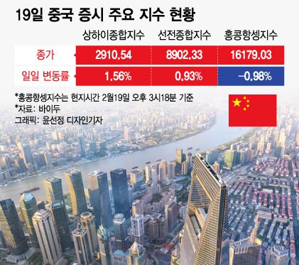지난 19일 중국 상하이종합지수는 전 거래일 대비 1.56% 오른 2910.54에 마감했다. 춘제 휴장(지난 9일~16일)을 마치고 거래를 시작하자 상하이 종합지수는 상승 출발해 보합세를 보이다가 상승 폭을 키웠다. 선전종합지수는 0.93% 오른 8902.33에 마감했다. 홍콩 항셍지수는 1.13% 하락 마감했다.