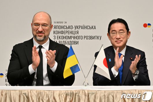 기시다 후미오 일본 총리가 19일(현지시간) 도쿄에서 열린 일본-우크라이나 경제 부흥 추진 회의 중 데니스 슈미할 우크라이나 총리와 참석을 하고 있다. 2024. 2, 19 ⓒ 로이터=뉴스1 ⓒ News1 우동명 기자 |