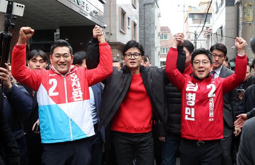 ● 민주당 지역구 찾아 여당 후보 손 들어올린 한동훈