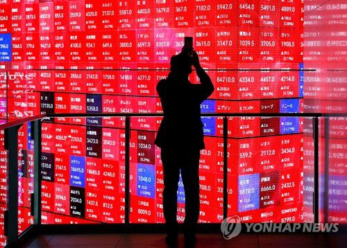 일본 증시 활황에 온통 빨간색 칠해진 전광판 |