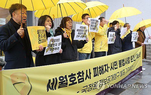 (서울=연합뉴스) 안정훈 기자 = 4·16세월호참사가족협의회와 4·16 연대는 21일 서울 중구 서울시의회 앞에서 기자회견을 열고 국가정보원에 유족 등 사찰 의혹 관련 자료를 정보공개 청구했다고 밝혔다.