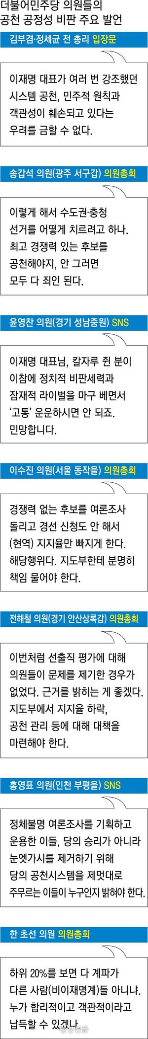 당 원로들도 이 대표를 향해 쓴소리했다. 김부겸 전 국무총리는 이날 임채정·김원기·문희상 전 국회의장과 비공개 회동을 하고, 이재명 대표의 ‘불공정 공천’ 문제에 강력한 유감을 표명했다. 김 전 총리는 정세균 전 국무총리와 공동성명을 내고 “이재명 대표가 지금의 상황을 바로 잡아야 한다”며 “대표가 여러 번 강조했던 시스템 공천, 민주적 원칙과 객관성이 훼손되고 있다는 우려를 금할 수 없다”고 밝혔다. 이들은 “이재명 대표를 비롯한 당 지도부가 초심으로 돌아가기를 바란다”며 “총선 승리를 위해 작은 이익을 내려놓아야 한다”라고 당부했다.