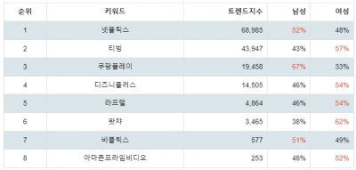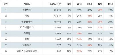 트렌드 지수 1위 넷플릭스의 빅데이터 조사한 결과, 넷플릭스 요금제, 넷플릭스 영화 추천, 넷플릭스 공유, 넷플릭스 드라마 추천, 넷플릭스 추천 등이 주목받는 관련 검색어로 나타났으며 2위 티빙은 티빙 요금제, 티빙 한달무료, 티빙 웨이브, 티빙 드라마, 티빙 추천, 3위 쿠팡플레이는 쿠팡플레이 tv연결, 쿠팡플레이 가격, 쿠팡플레이 추천, 쿠팡플레이 드라마, 쿠팡플레이 해지 등으로 나타났다.
