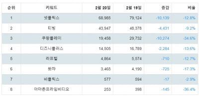 티빙은 43,947포인트로 전일보다 4,431포인트 하락해 2위를 차지했다. 쿠팡플레이, 디즈니플러스, 라프텔, 왓챠, 비플릭스, 아마존프라임비디오가 뒤를 이으며 3~8위를 기록했다.