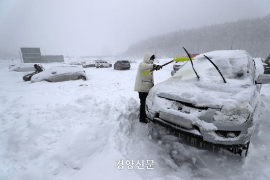 강원 동해안과 산간을 중심으로 30㎝ 안팎의 많은 눈이 내린 21일 강원 평창군 대관령 일대에서 시민들이 삽으로 차에 쌓인 눈을 치우고 있다. 2024.02.21. 조태형 기자 |