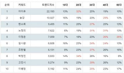 연령별 선호도에서는 아이유가 10대 13%, 20대 32%, 30대 25%, 40대 19%, 50대 10%로 나타났다.