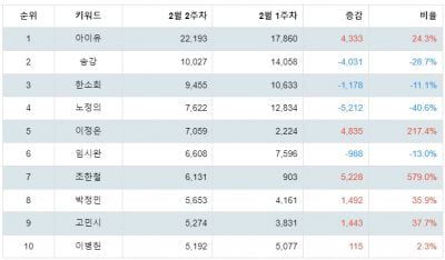 트렌드 지수 1위 아이유의 빅데이터 조사한 결과, 아이유 콘서트, 아이유 노래, 아이유 드라마, 아이유 단발 등이 주목받는 관련 검색어로 나타났으며 2위 송강은 송강 군대, 송강 김유정, 송강 한소희, 송강 과사, 3위 한소희는 한소희 블로그, 한소희 가방, 한소희 송강 등으로 나타났다.