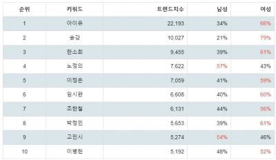 성별 선호도 분석 결과 1위 아이유는 남성 34%, 여성 66%, 2위 송강은 남성 21%, 여성 79%, 3위 한소희는 남성 39%, 여성 61%가 선호하는 것으로 나타났다.