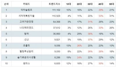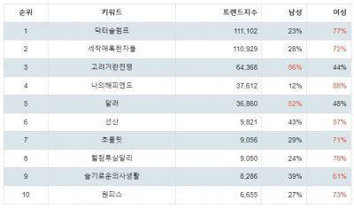 트렌드지수 1위 닥터슬럼프의 빅데이터 조사한 결과, 닥터슬럼프 아리, 닥터슬럼프 드라마, 닥터슬럼프 만화, 닥터슬럼프 원작 등이 주목받는 관련 검색어로 나타났으며 2위 세작 매혹된 자들은 세작 매혹된 자들 등장인물, 세작 매혹된 자들 몇부작, 세작 매혹된 자들 배경, 3위 고려거란전쟁은 고려거란전쟁 몇부작, 고려거란전쟁 시청률, 고려거란전쟁 등장인물, 고려거란전쟁 결방 등으로 나타났다.