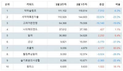 닥터슬럼프가 트렌드지수 111,102포인트로 전주보다 7,512포인트 하락해 1위를 차지했다.