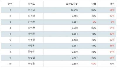 연령별 선호도에서는 이하늬가 10대 5%, 20대 15%, 30대 22%, 40대 30%, 50대 26%로 나타났다.