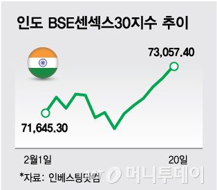 인도 증시 벤치마크인 BSE센섹스지수는 20일(현지시간) 종가 기준으로 이달 들어 1.8% 상승을 기록 중이다. 아시아 내 경쟁 시장인 한국(코스피 6.4%)이나 대만(자취안 4.8%), 중국(상하이종합 5.4%) 상승률에 못 미치는 성적이다. 올해 상승폭은 1.1%에 그친다.