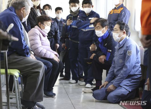[스즈(이시카와현)=AP/뉴시스] 극심한 지지율 침체에 시달리고 있는 기시다 후미오 일본 총리가 노토반도 지진 피해 지역을 다시 찾는다. 기시다 총리(오른쪽)가 지난달 14일 노토 지진 최대 피해 지역 중 한 곳인 이시카와현 스즈시의 한 대피소를 찾아 피난민들의 의견을 듣고 있다. 2024.02.22. |