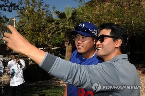 류현진이 다저스에서 뛰던 때 함께 사진 찍는 박찬호 |