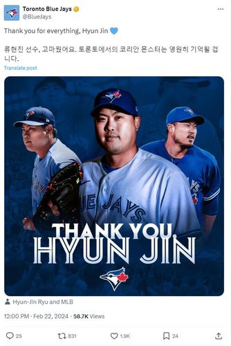이 덕분에 토론토 구단이 올린 게시물에는 '우리 팀이 새로운 시대를 시작할 기회를 줬다', '토론토의 변화를 도와줬다', '진정한 에이스였다' 등 현지 팬들의 긍정적인 댓글이 줄을 잇고 있다.