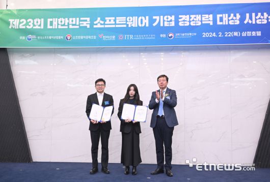 제23회 대한민국 소프트웨어 기업 경쟁력 대상 시상식이 한국소프트웨어산업협회, 소프트웨어공제조합, 전자신문, 기업정보연구화센터 공동 주최로 22일 서울 역삼동 삼정호텔에서 열렸다. 강병준 전자신문 대표가 전자신문 사장상 수상자들을 축하하고 있다. 박지호기자 jihopress@etnews.com [Copyright © 전자신문. 무단전재-재배포금지]