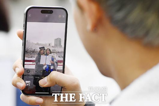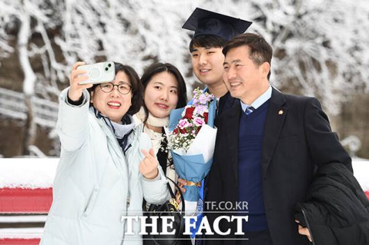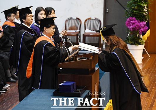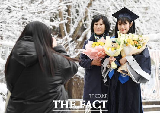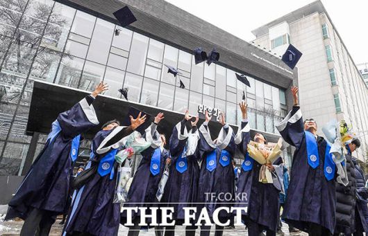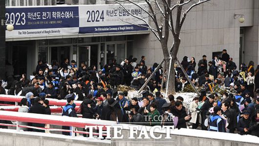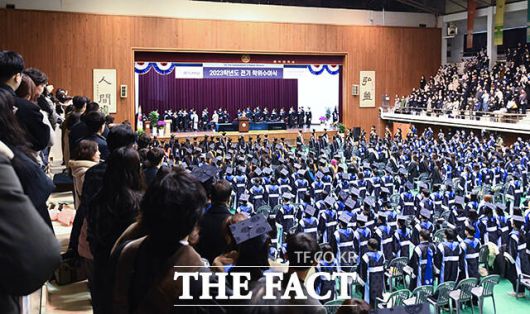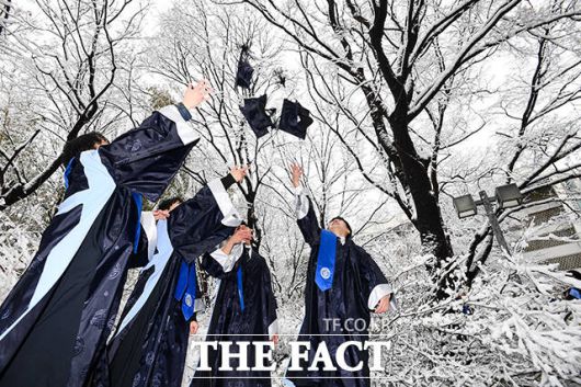 [더팩트ㅣ장윤석 기자] 22일 오전 서울 마포구 홍익대학교에서 열린 '2023학년도 전기 학위수여식'에서 졸업생들이 학사모를 던지고 있다. 이날 열린 학위수여식은 학사와 석사, 박사 학위수여식이 같이 진행됐다.