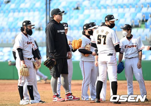 [OSEN=스코츠데일(미국 애리조나주), 지형준 기자] 헌화 이글스 박찬혁 대표이사가 손혁 단장과 경기를 지켜보고 있다. 2023.02.22 /jpnews@osen.co.kr |