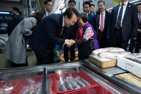 윤석열 대통령이 22일 경남 창원시 마산합포구 마산어시장을 찾아 상인들과 인사하고 있다. (사진=연합뉴스) |