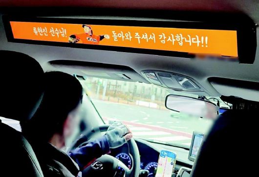 류현진의 한화 복귀가 확정된 22일 한화의 안방 대전 지역 택시 안에는 ‘류현진 선수님! 돌아와 주셔서 감사합니다!!’라는 문구의 배너가 등장했다. 대전=뉴스1 |