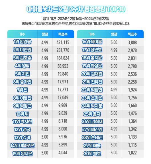 가수 임영웅이 2월 3주차 아이돌 차트 평점 랭킹에서 최다득표자에 올랐다.