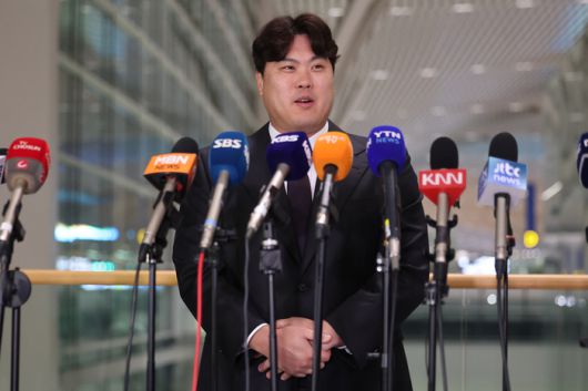 한화 류현진이 23일 오전 인천공항에서 취재진 질문에 답하고 있다. 연합뉴스 |
