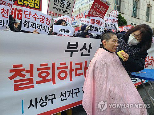 부산 사상구 공천에서 탈락한 송숙희 예비후보는 이날 여의도 중앙당사 앞에서 "특혜 단수공천 철회"를 주장하며 삭발했다.