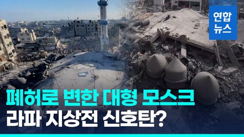 (서울=연합뉴스) 팔레스타인 가자지구 최남단 라파에서 지상전을 전개하겠다고 예고한 이스라엘이 22일(현지시간) 공습으로 라파 도심의 대형 모스크를 파괴하는 등 공격 수위를 끌어올렸습니다.