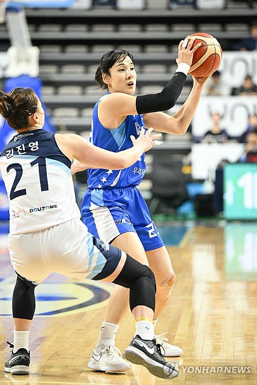 (아산=연합뉴스) 23일 오후 충남 아산시 이순신체육관에서 열린 우리은행 우리WON 2023∼2024 여자프로농구 아산 우리은행과 인천 신한은행의 경기. 신한은행 김진영이 우리은행 김단비의 공격을 방어하고 있다. 2024.2.23 [WKBL 제공. 재판매 및 DB 금지]