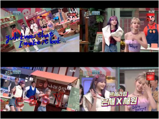 24일 방영된 tvN 예능 ‘놀라운 토요일’(이하 '놀토')에서는 르세라핌의 은채와 채원이 등장했다. 르세라핌의 은채와 채원은 등장하자마자 신곡. ‘EASY’(이지)의 메인 퍼포먼스를 선보였다. 은채는 보라색 머리에 숏팬츠, 그리고 독특한 조끼를 입었으며 채원은 오픈숄더에 크롭 상의로 Y2K 패션을 뽐냈다.