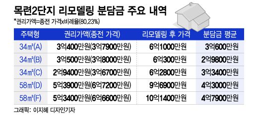 목련2단지 리모델링주택조합의 권리변동계획에 따르면 34㎡의 리모델링 전 주택가격은 평균 3억6000만~3억81000만원 정도다. 비례율 80.23%를 적용한 추정권리가액은 2억9000만~3억3000만원이다. 조합원이 내야 할 분담금은 2억9000만~3억3000만원 안팎이다. 다른 전용 58㎡는 분담금이 더 많다. 권리가액(비례율 80.23%)은 5억2800만~5억4200만원으로, 조합원 평균 분담금은 4억3000만~4억7900만에 달한다.