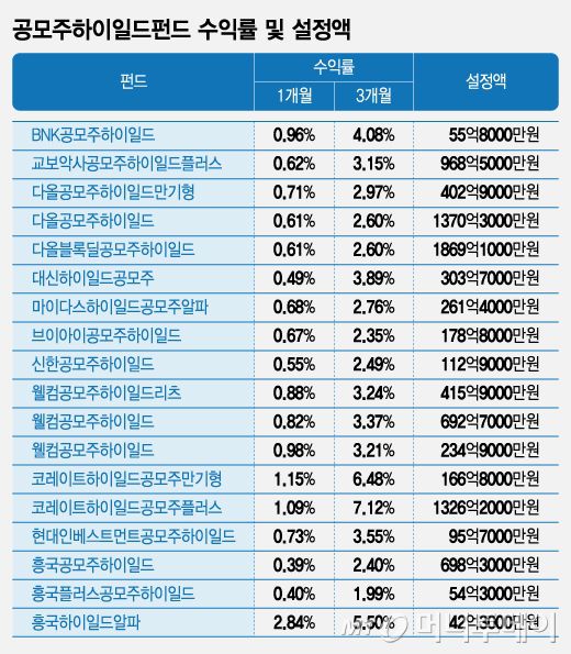 27일 금융정보업체 에프앤가이드에 따르면 최근 한달간 국내 공모주하이일드펀드에는 1061억원의 자금이 들어와 약 9200억원을 기록하고 있다. 다올공모주하이일드펀드, 다올블록딜공모주하이일드펀드에 각각 225억원, 204억원의 자금이 유입됐고 코레이트하이일드공모주플러스 펀드도 319억원 설정액이 늘었다. 공모시장 활황으로 이들의 수익률도 양호하다. 공모주하이일드펀드 18종의 3개월 수익률은 2~7%를 기록하고 있다