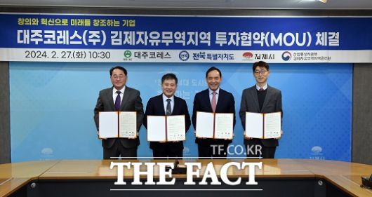 전북도는 27일 김제시청에서 정성주 김제시장을 비롯해 김종훈 경제부지사, 배기환 김제자유무역지역관리원장, 양명환 대주코레스 대표, 김영자 김제시의회 의장 등이 참석한 가운데 생산시설 신설을 위한 투자협약을 체결했다고 밝혔다.