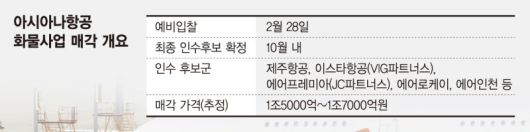 27일 항공업계에 따르면 아시아나항공 화물사업 인수 후보군은 현재 제주항공, 이스타항공, 에어프레미아, 에어로케이, 에어인천 등 5곳으로 추려진다. 이들 가운데 인수 희망자는 28일 오후 2시까지 자금 조달 계획서, 사업계획서를 포함한 입찰제안서를 아시아나항공 화물사업부 매각 주관사인 UBS에 제출해야 한다. UBS는 최근 잠재 인수 후보군을 대상으로 투자설명서를 보냈다.