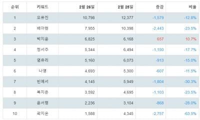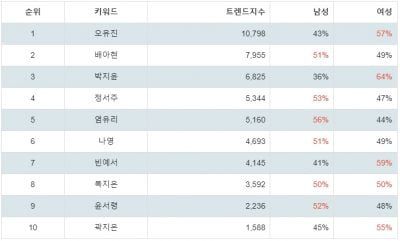 오유진은 트렌드지수 10,798포인트로 전일보다 1,579포인트 하락해 1위를 차지했다.