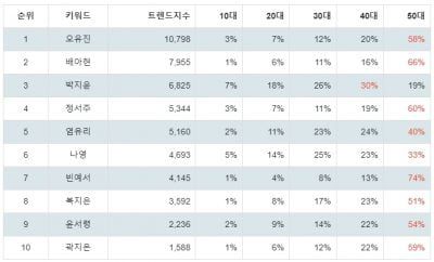 트렌드지수 1위 오유진의 빅데이터 조사한 결과, 오유진 아빠, 오유진부모, 오유진 가족 등이 주목받는 관련 검색어로 나타났으며 2위 배아현은 배아현 소속사, 배아현 가수, 배아현 인스타, 3위 박지윤은 박지윤 가수 등으로 나타났다.