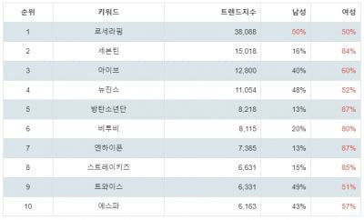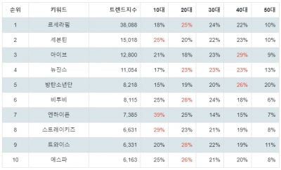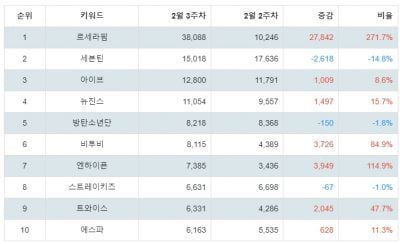 트렌드 지수 1위부터 3위까지 빅데이터로 조사한 결과, 르세라핌 소속사, 르세라핌 김채원, 르세라핌 오버워치, 르세라핌 은채, 세븐틴 소속사, 세븐틴 빙의글, 세븐틴 민규, 세븐틴 원우, 세븐틴끼리 카톡하기, 아이브 앨범, 아이브 소속사, 아이브 포카, 아이브 레이, 아이브 가을 등이 주목받는 연관 검색어로 나타났다.