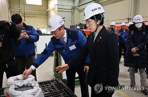 한화진 환경부 장관이 지난달 29일 오전 인천 서구에 위치한 태양광 폐패널 재활용 전문기업인 원광에스앤티를 방문해 이상헌 대표이사의 설명을 듣고 있다. [연합뉴스 자료사진] |