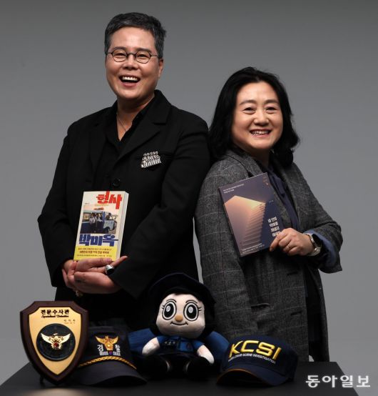 최근 신간 ‘내 안의 악마를 꺼내지 마세요’를 출간한 1호 여성 프로파일러 이진숙 경위(오른쪽)와 지난해 ‘형사 박미옥’을 펴낸 1호 여성 강력계 형사 박미옥 전 경정이 26일 서울 종로구 동아미디어센터에서 자신의 책을 들고 있다. 양회성 기자 yohan@donga.com |