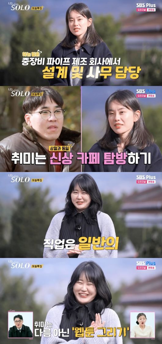 다음으로 부산에 살고 있다는 옥순은 “중장비 파이프 제조 회사, 포크레인이나 굴삭기에 들어가는 파이프 제조 회사에서 설계 및 사무를 담당하고 있다”라며 반전 매력을 선사했다. 나이 차이로는 ‘띠동갑’만 아니면 된다는 옥순은 취미로 신상 카페 탐방하기라고 이야기했다.