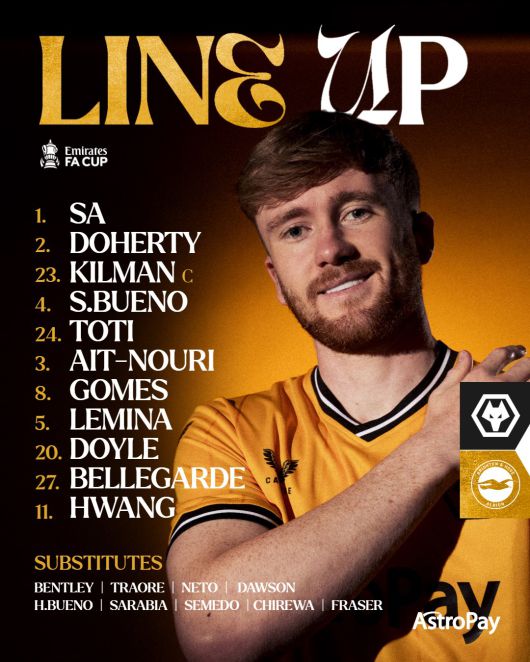 울버햄프턴은 3-5-2 전형으로 나섰다. 조세 사 골키퍼를 비롯해 토티 고메스, 우고 부에노, 맥스 킬먼이 백3를 구성했다. 중원은 토미 도일, 마리오 르미나, 주앙 고메스가 지켰고 윙백은 라얀 아이트누리, 맷 도허티가 맡았다. 최전방에는 벨레가르드와 황희찬이 출격했다.