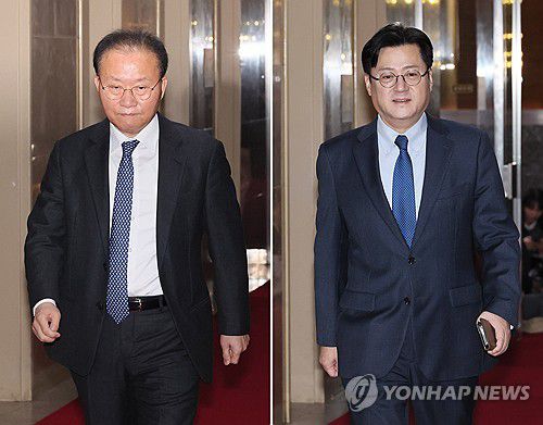 윤 원내대표는 기자들이 '쌍특검법' 재표결 여부를 묻자 "당연히 (본회의에) 같이 올라간다"고 했고, 홍 원내대표도 "같이 처리하기로 했다"고 확인했다.