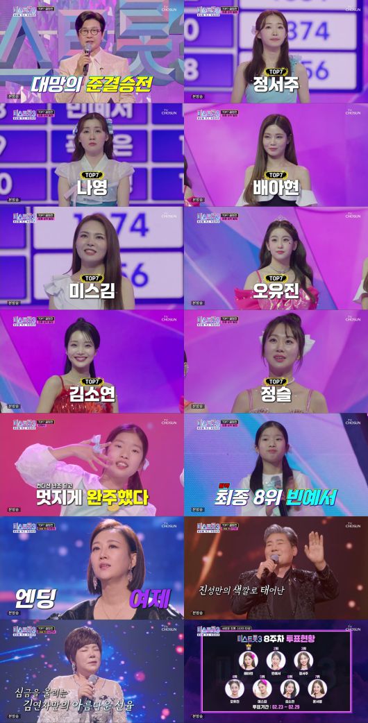 [스타데일리뉴스=천설화 기자] 정서주, 나영, 배아현, 미스김, 오유진, 김소연, 정슬이 TV CHOSUN '미스트롯3' 최후의 TOP7에 등극했다.