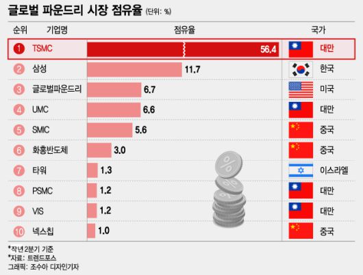 3위 폭스콘은 애플 최대 협력업체로서 반도체기업은 아니지만, 전자제품 제조업체이며 5위 퀀타컴퓨터는 애플 맥북을 위탁생산하는 세계 최대 컴퓨터 ODM(제조업자 설계생산) 업체다. 대만은 반도체 업체뿐 아니라 전자제품 위탁 생산업체들이 발달했다.