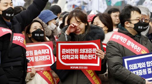 3일 서울 여의도공원 옆 여의대로 인근에서 열린 '의대정원 증원 및 필수의료패키지 저지를 위한 전국 의사 총궐기대회'에서 한 의사가 눈물을 흘리고 있다. 3일 서울 여의도공원 옆 여의대로 인근에서 열린 '의대정원 증원 및 필수의료패키지 저지를 위한 전국 의사 총궐기대회'에 의사들이 참석하고 있다. 이재문 기자 ⓒ 세상을 보는 눈, 세계일보