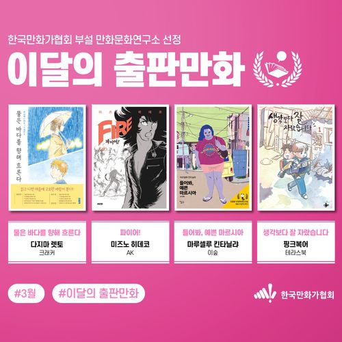 (서울=연합뉴스) 김경윤 기자 = 한국만화가협회 부설 만화문화연구소는 4일 '이달의 출판만화' 3월 작품으로 '생각보다 잘 자랐습니다', '물은 바다를 향해 흐른다', '파이어!', '들어봐, 예쁜 마르시아' 등 4편을 선정했다.
