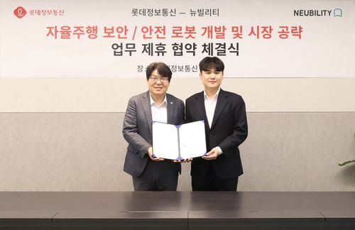 (서울=연합뉴스) 최현석 기자 = 롯데정보통신[286940]은 지난달 28일 본사에서 자율주행로봇 서비스 기업 뉴빌리티와 자율주행 보안, 안전 로봇 개발 및 시장 공략을 위한 업무제휴 협약(MOU)을 체결했다고 4일 밝혔다.